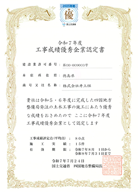 国土交通省 四国地方整備局長 工事成績優秀企業認定 表彰実績 一覧 施工実績 一覧 国土交通省 四国地方整備局長 工事成績優秀企業認定 表彰元国土交通省 四国地方整備局長表彰内容令和7年度 工事成績優秀企業認定表彰日2025年7月24日 令和7年度(2025年度) 表彰実績, 表彰実績 徳島県土木施工管理技士会 前の記事 三好労働基準協会 労働安全衛生 吉岡勇二 次の記事