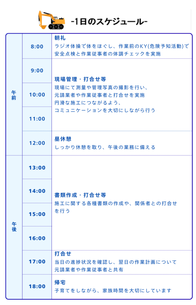 日々の業務では、現場で作業員に指示を出すほか、事務所で施工計画も立てており、現場作業とデスクワークの両方に取り組んでいます。
