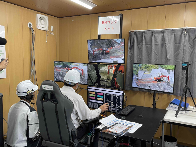 見学会では、バックホウとキャリアダンプを遠隔操作し、砂防土工の一連の施工サイクルを実演されていました。現場から離れた制御室(無線操作室)にてWi-Fiによる無線操作が行われ、操作に必要な映像はWi-Fiと人工衛星(スターリンク)を組み合わせて伝送されました。実際の施工を間近で体感出来る貴重な機会となりました。
