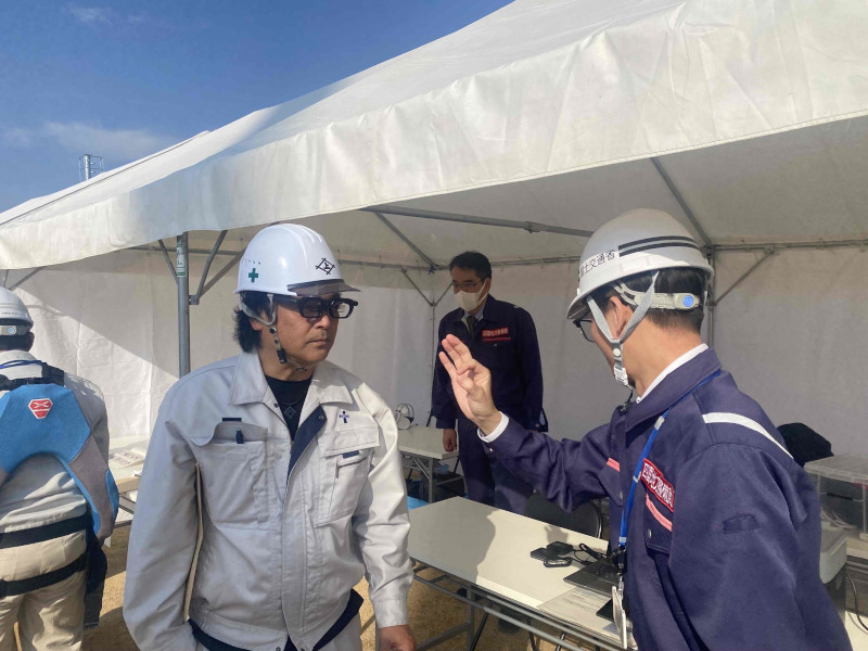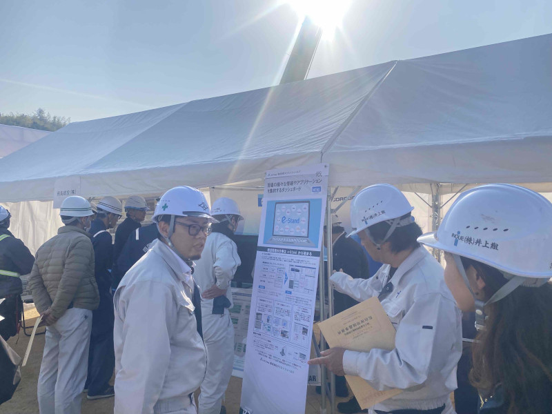 当日は、現在施工中の今治朝倉IC建設現場の概要説明を受けた後、各ブースにおいて最新技術の体験を行いました。高品質なレンダリングと高い再現性を実現する「3Dガウシアン・スプラッティング」や、設計図・施工手順をAR表示できる「スマートグラス」などを実際に体験し、建設現場におけるDX技術の有効性を実感する機会となりました。